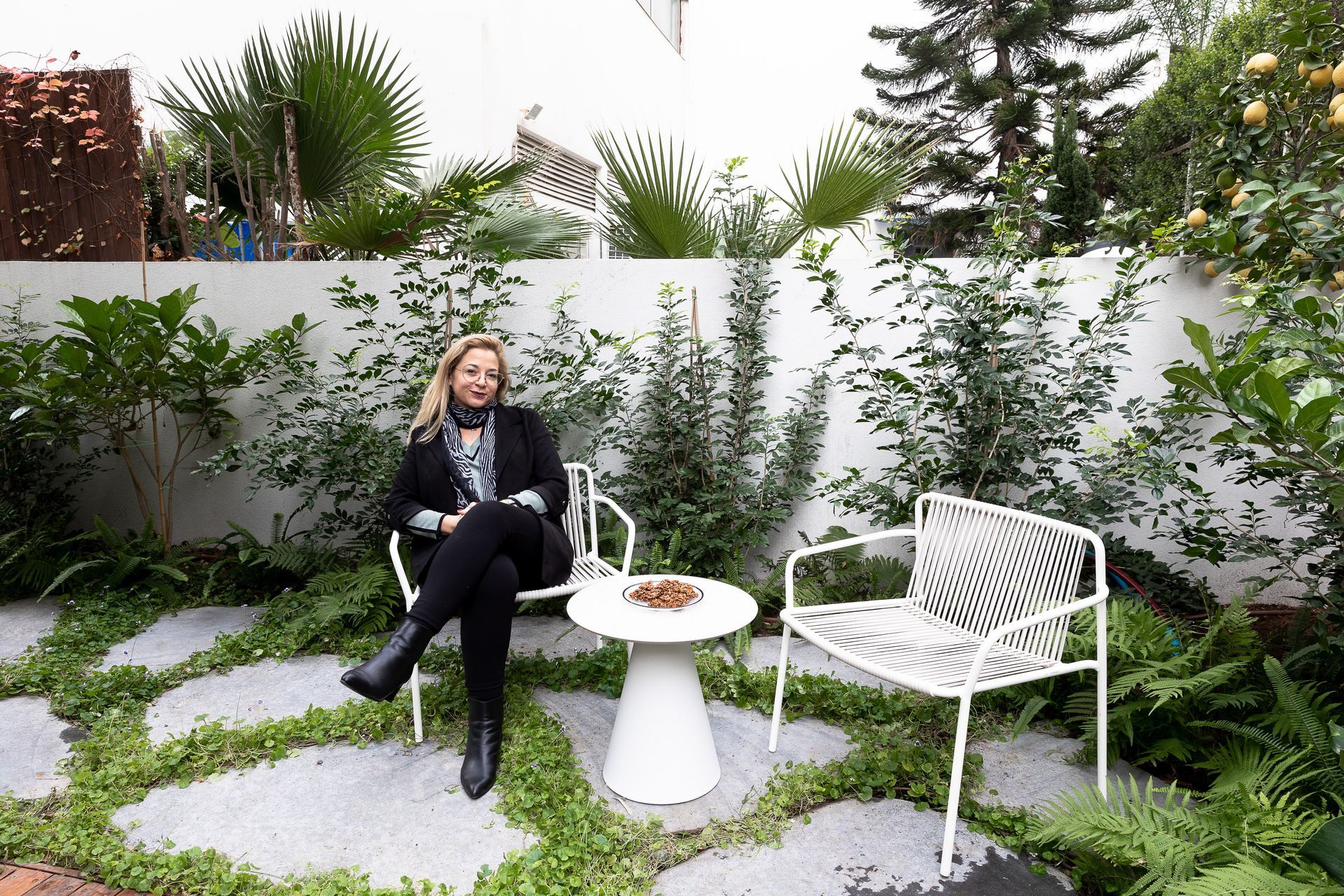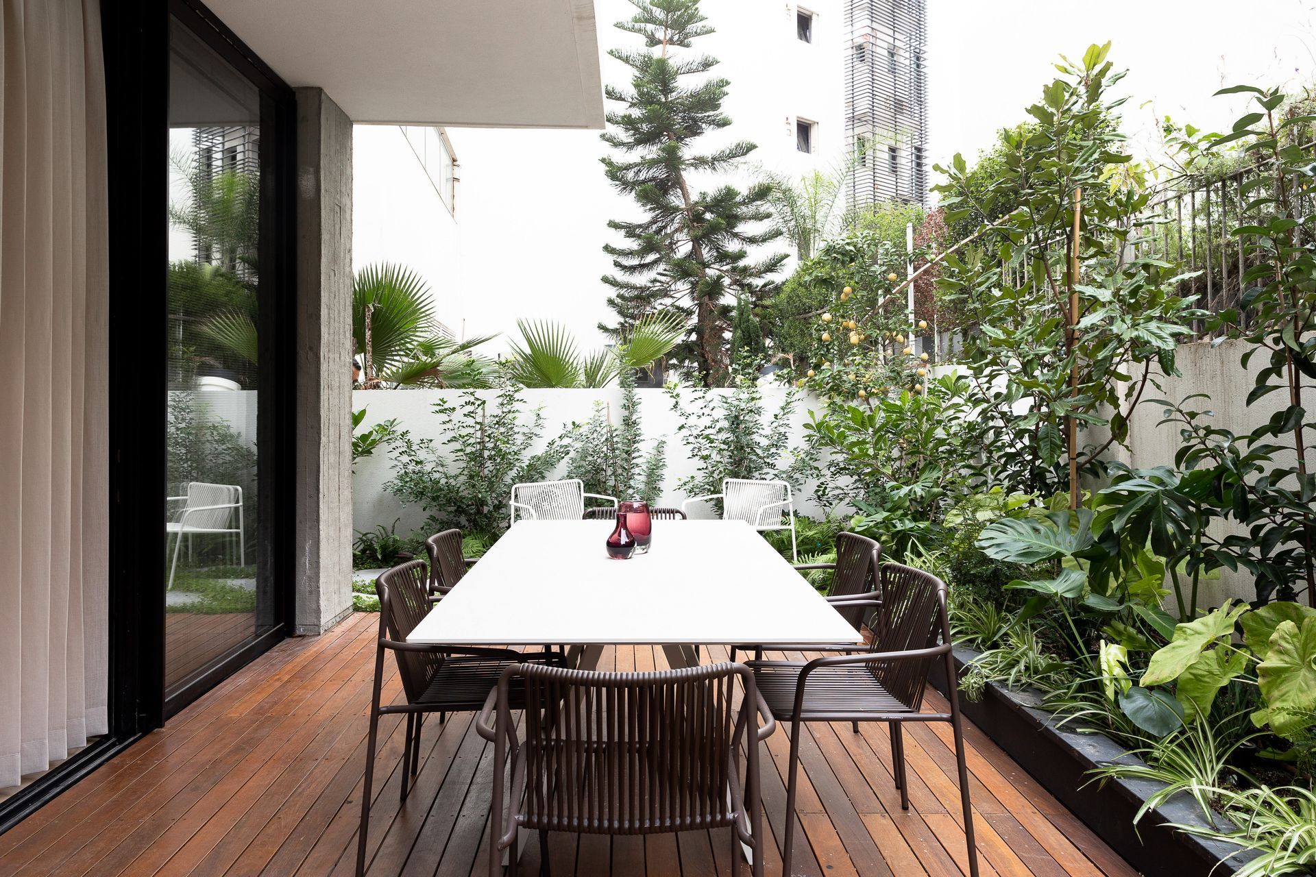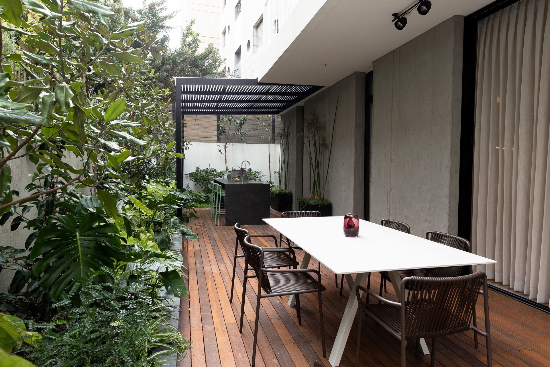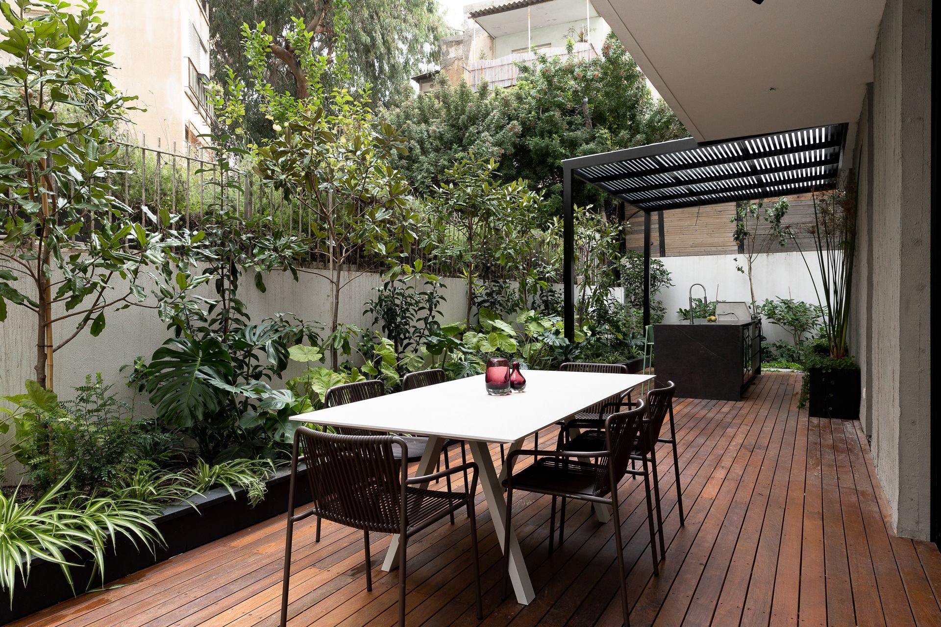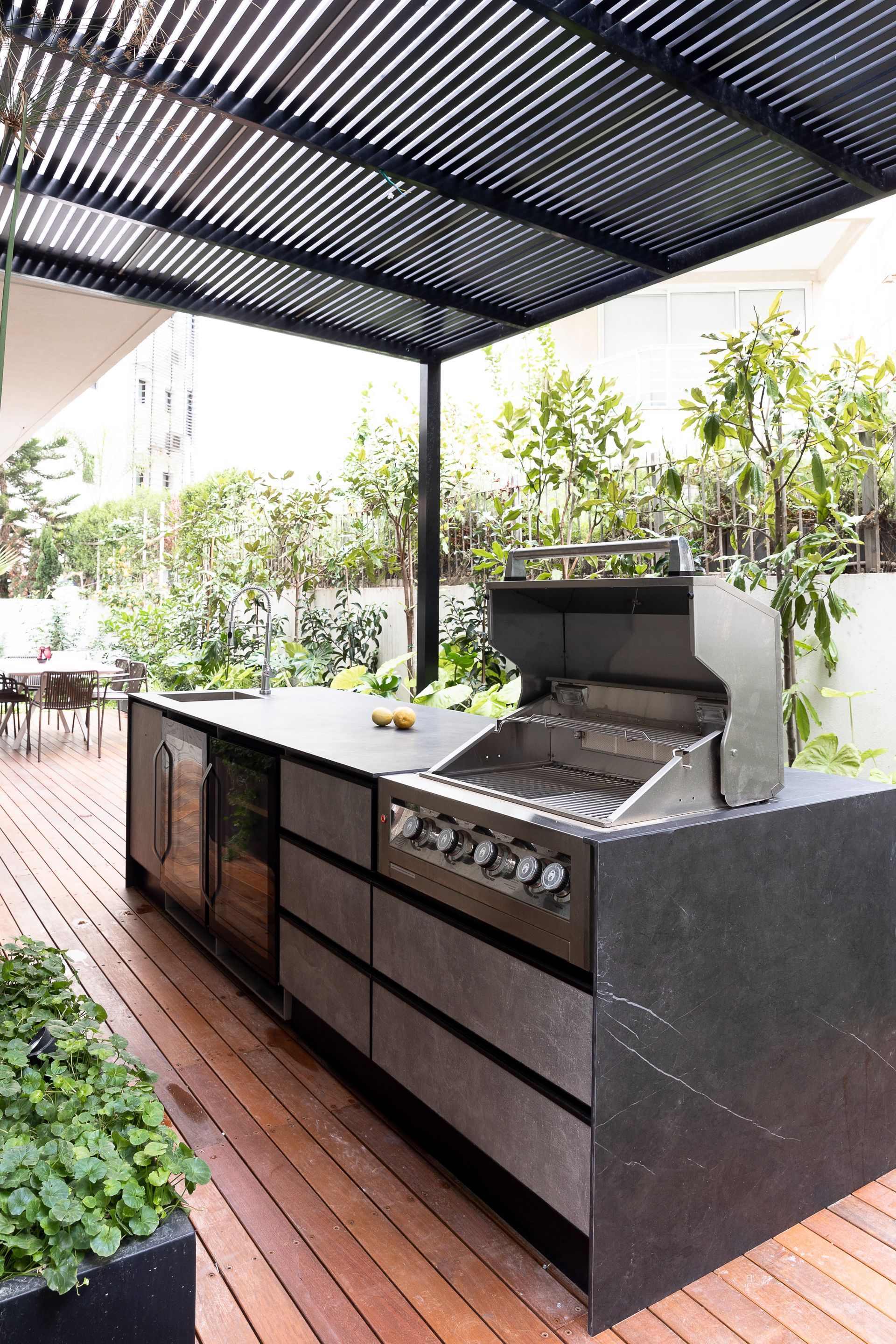 הדירה נוצרה בעיקר לארוח במרכז ולכן יצרנו בגינה מטבח חוץ מפנק ואזור ישיבה מרווח.